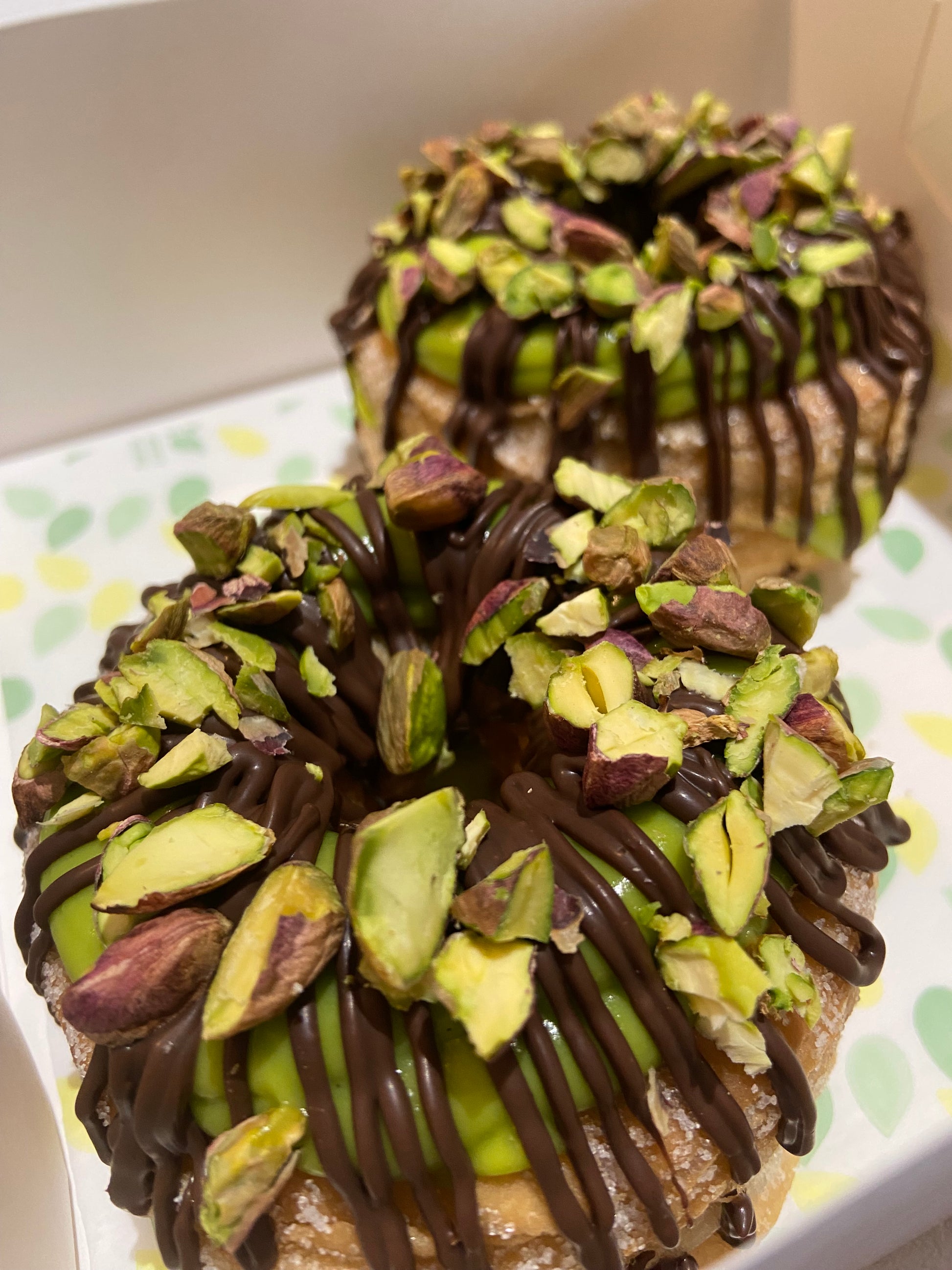 Pistachio: Filled with a pistachio cream made using Imported Authentic Italian Pistacchio paste, topped with dark chocolate and chopped pistachio nuts.